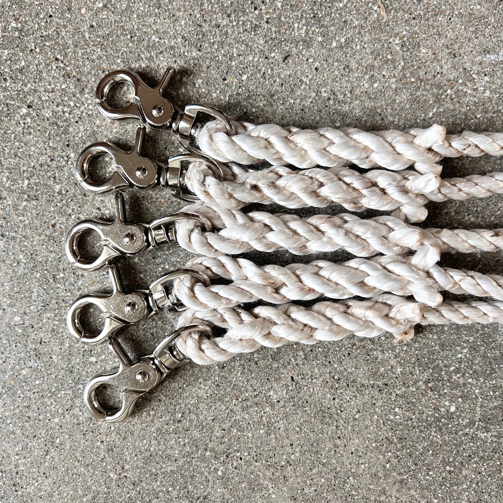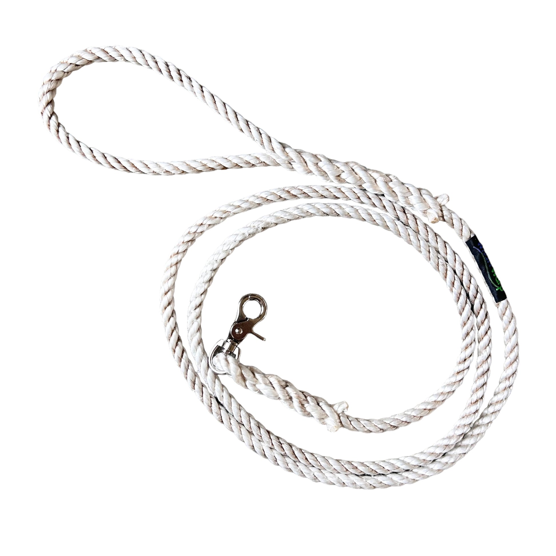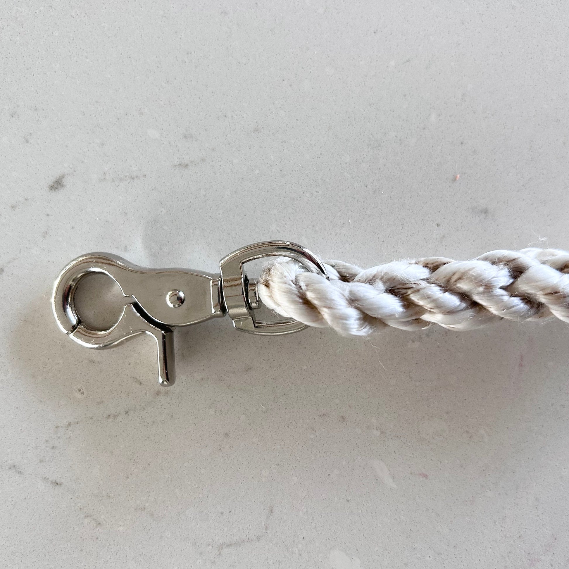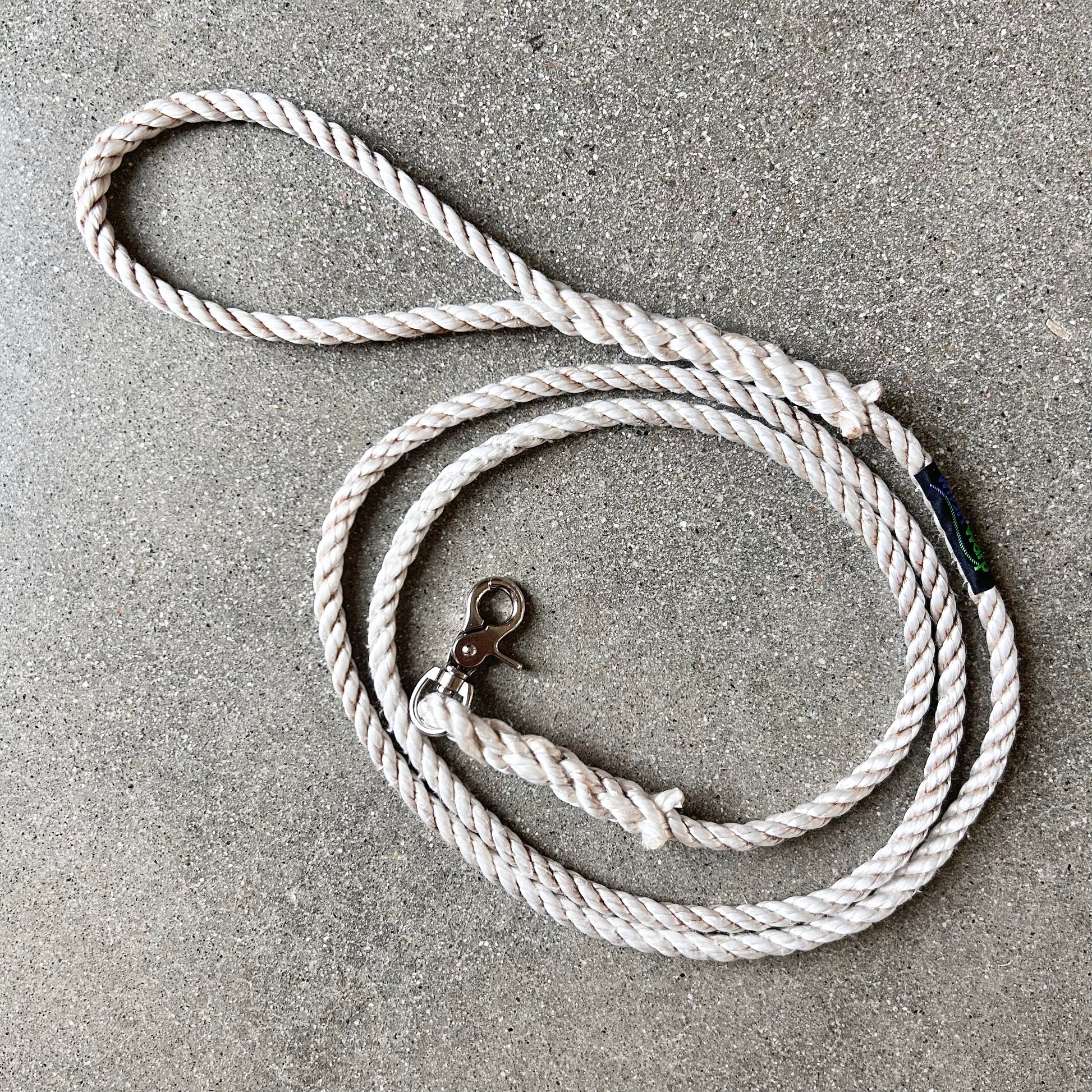 Handmade in Freeport, Maine using 100% reclaimed rope collected during Maine Island Trail cleanups, and new nickel plated zinc alloy swivel eye trigger snap.