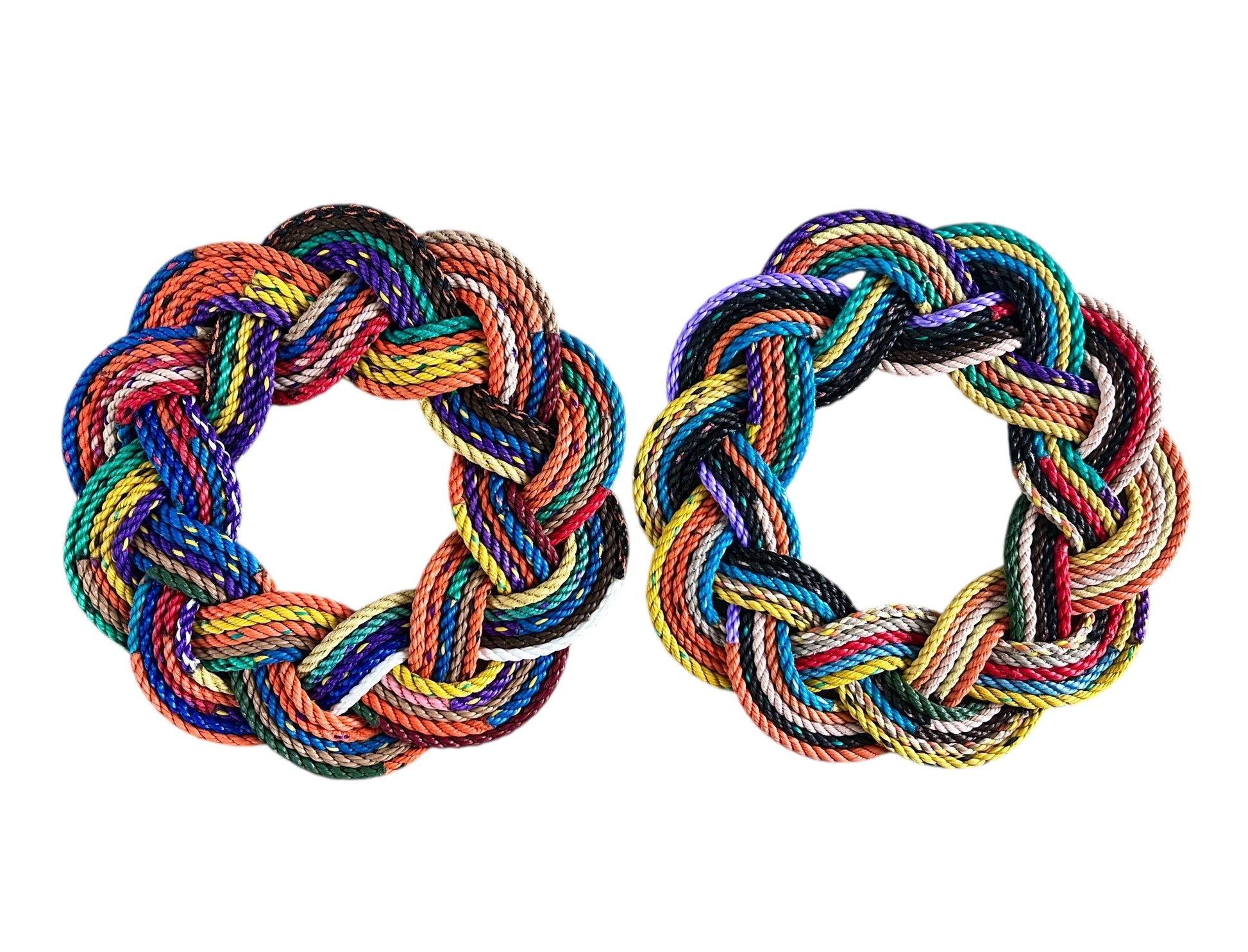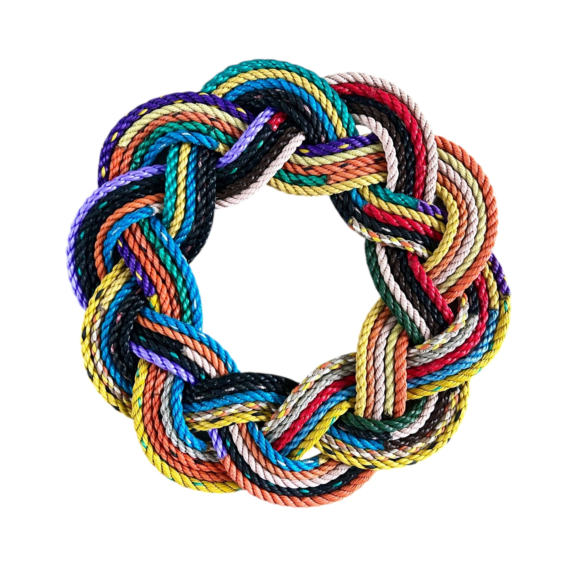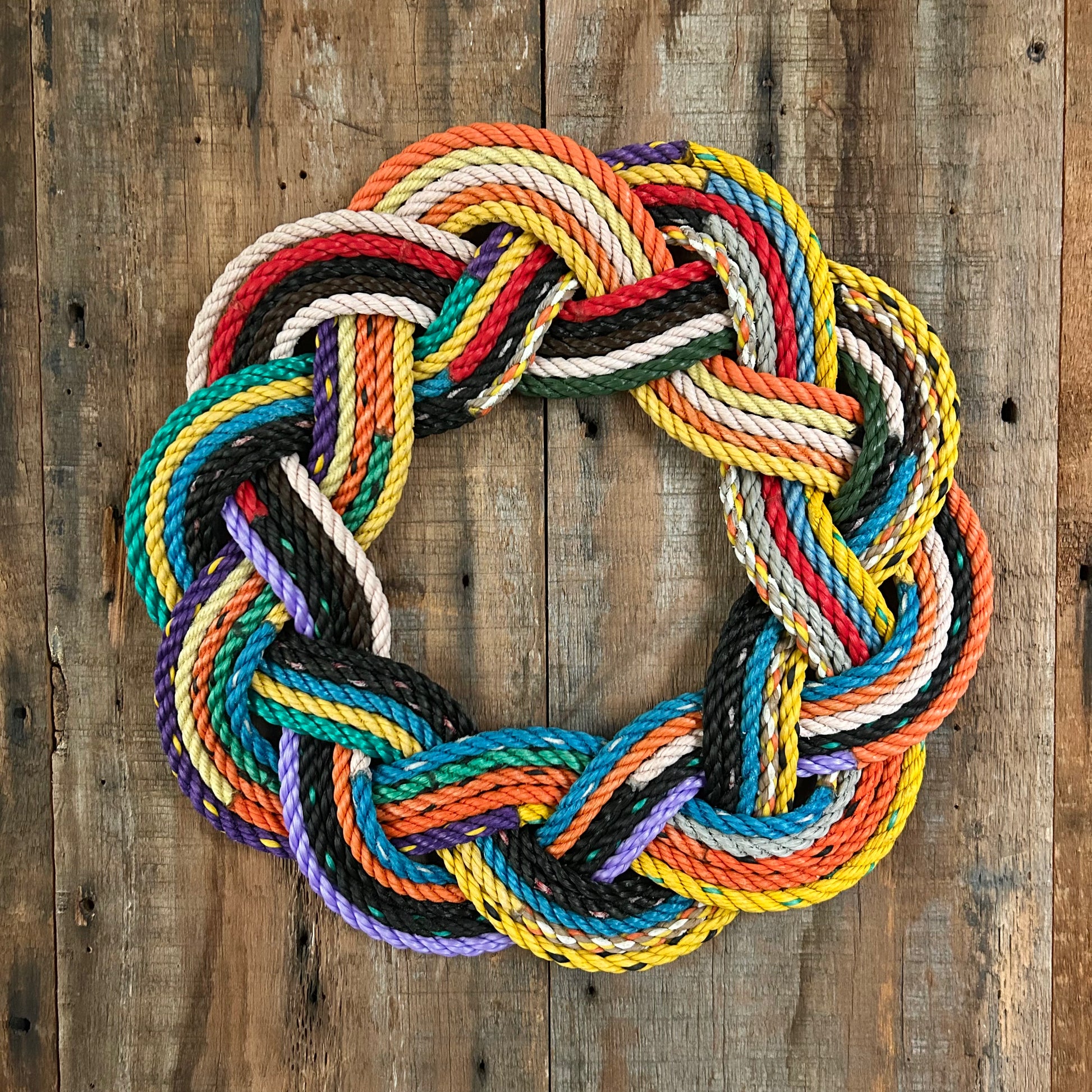 This bright and colorful one-of-a-kind wreath is at the pinnacle of our upcycling efforts. Using leftover "short" pieces we reconstruct lengths of vibrant rope and weave them into this wreath which reminds us of the colorful lobster buoys found in abundance along the Maine coast.