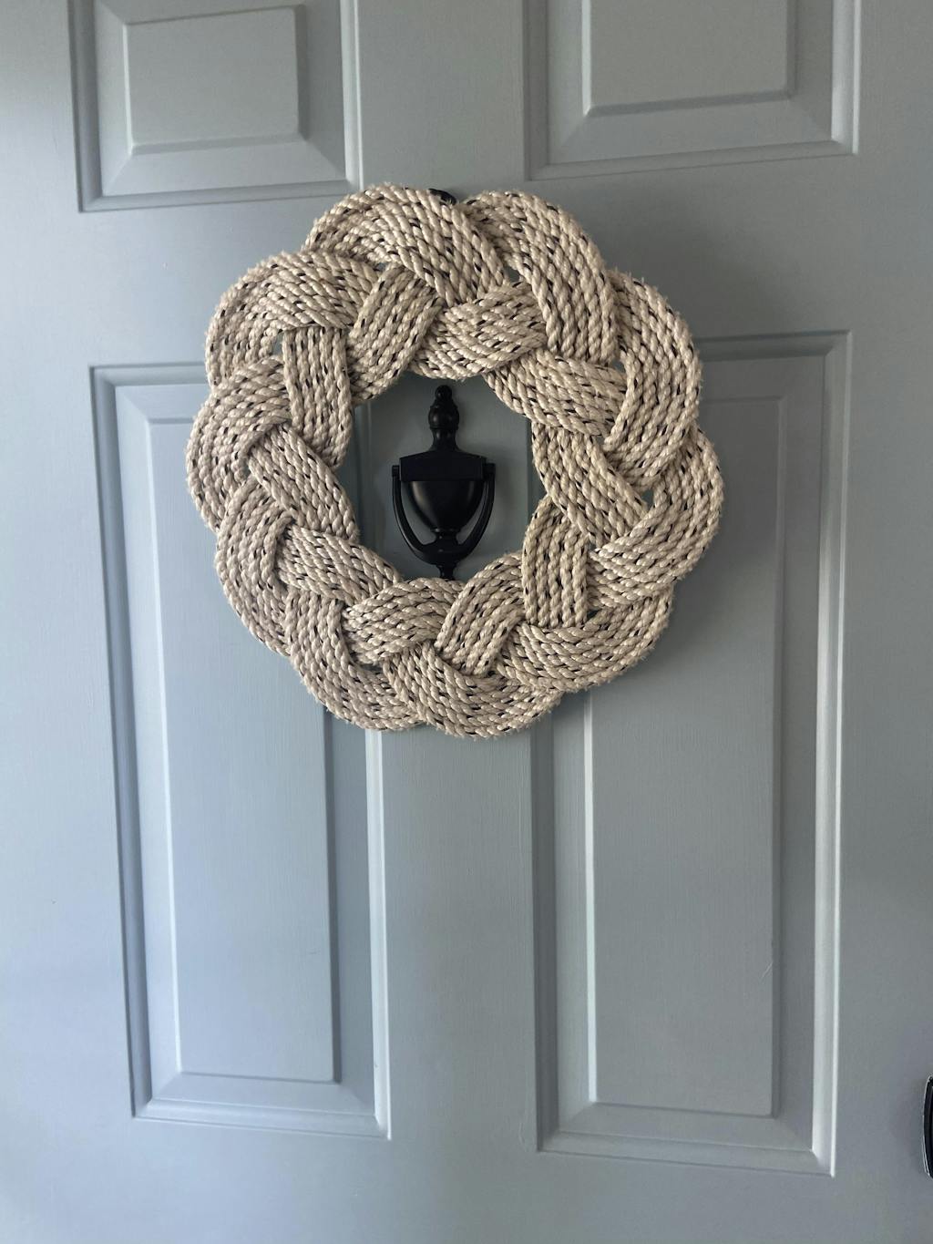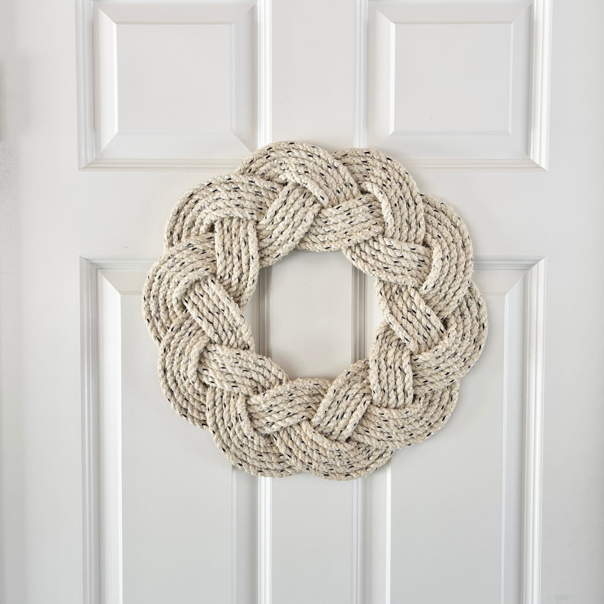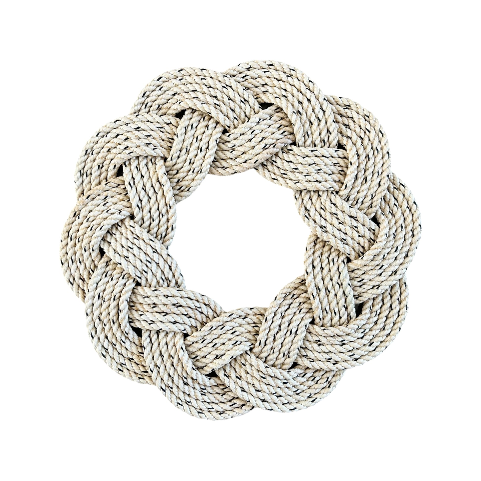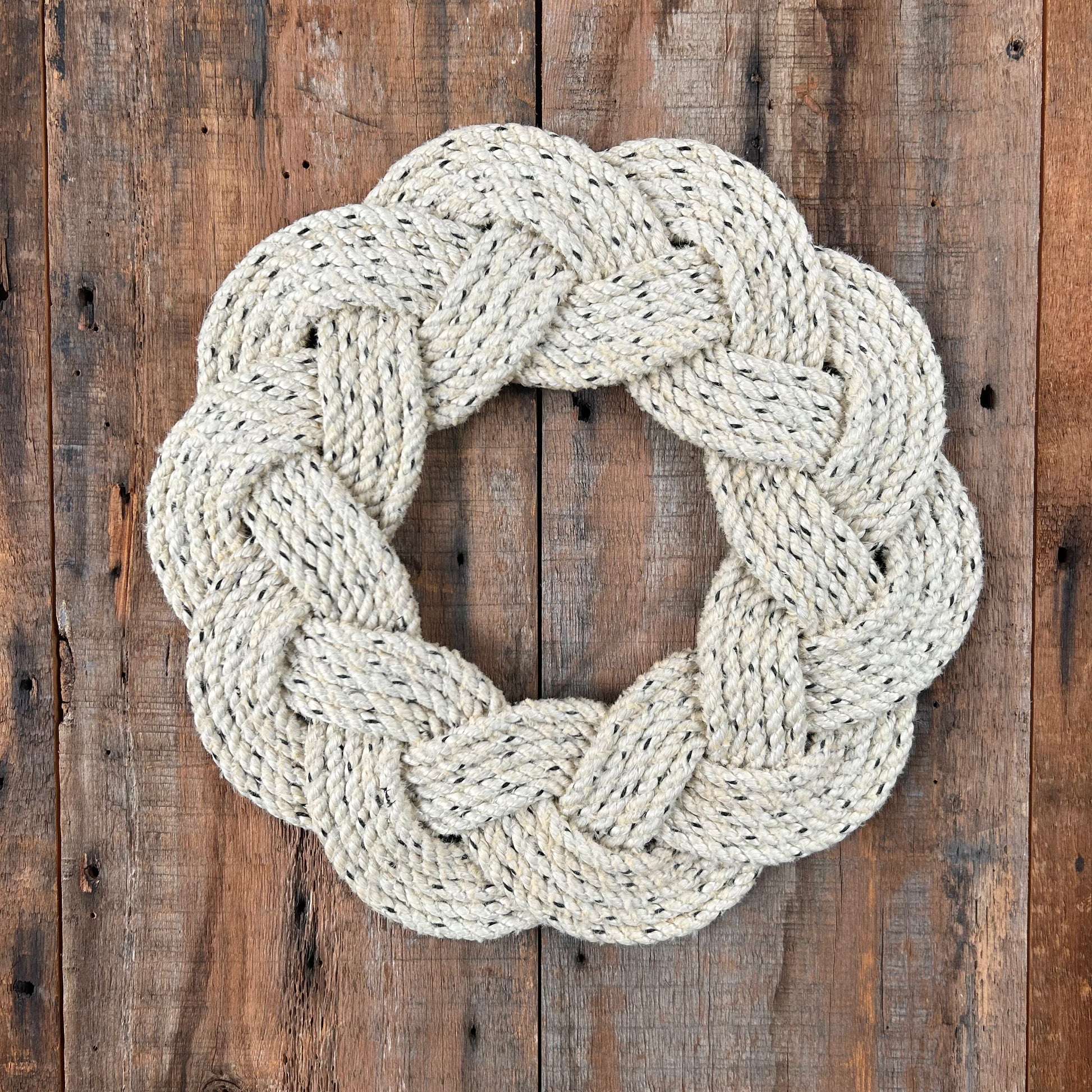 Sailors love knots like our Mariner Wreath, twisted, tied and ready for your door! Off-white with a black fleck, you can add your own decorations, or let the nautical weave be the star. Finish option is a heat treatment to melt away loose fibers.